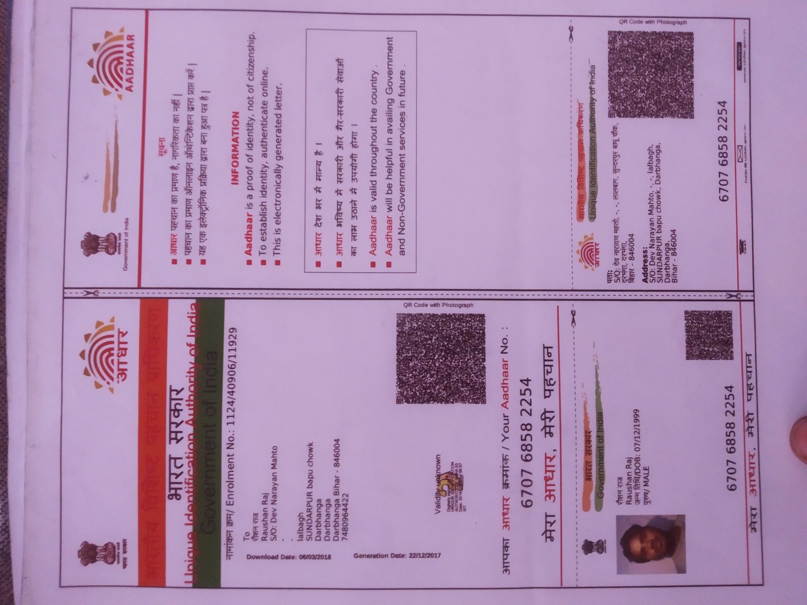 Aadhar No6707-6858-2254