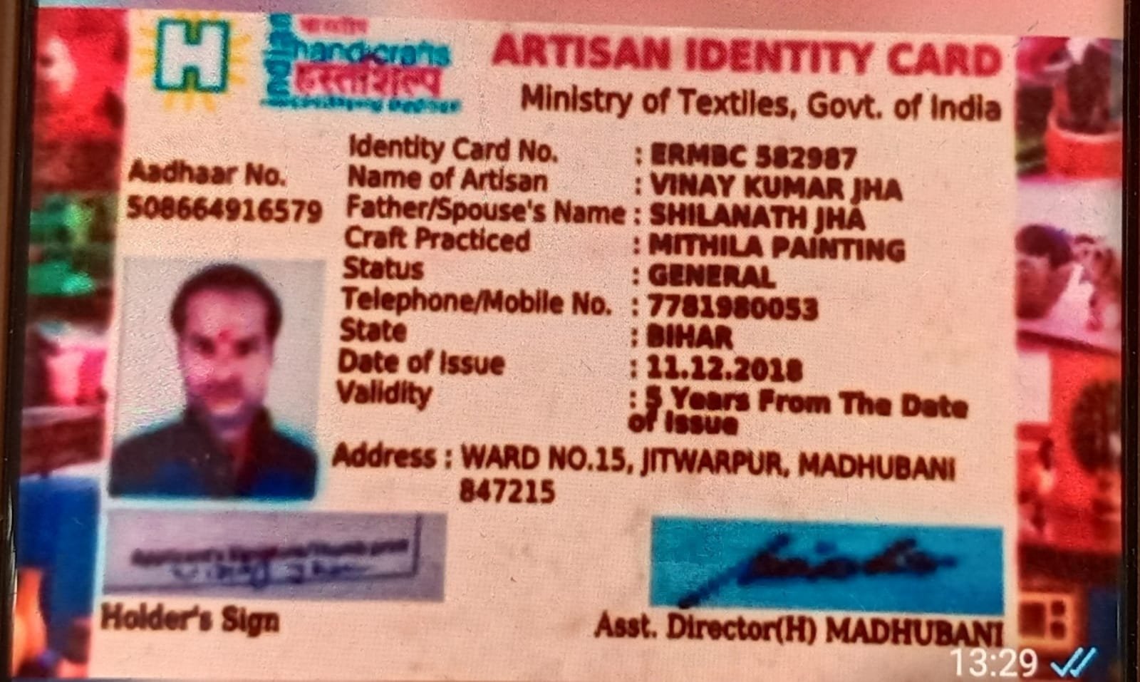 Artisan Card No /Udyam Reg NoErmbc582987