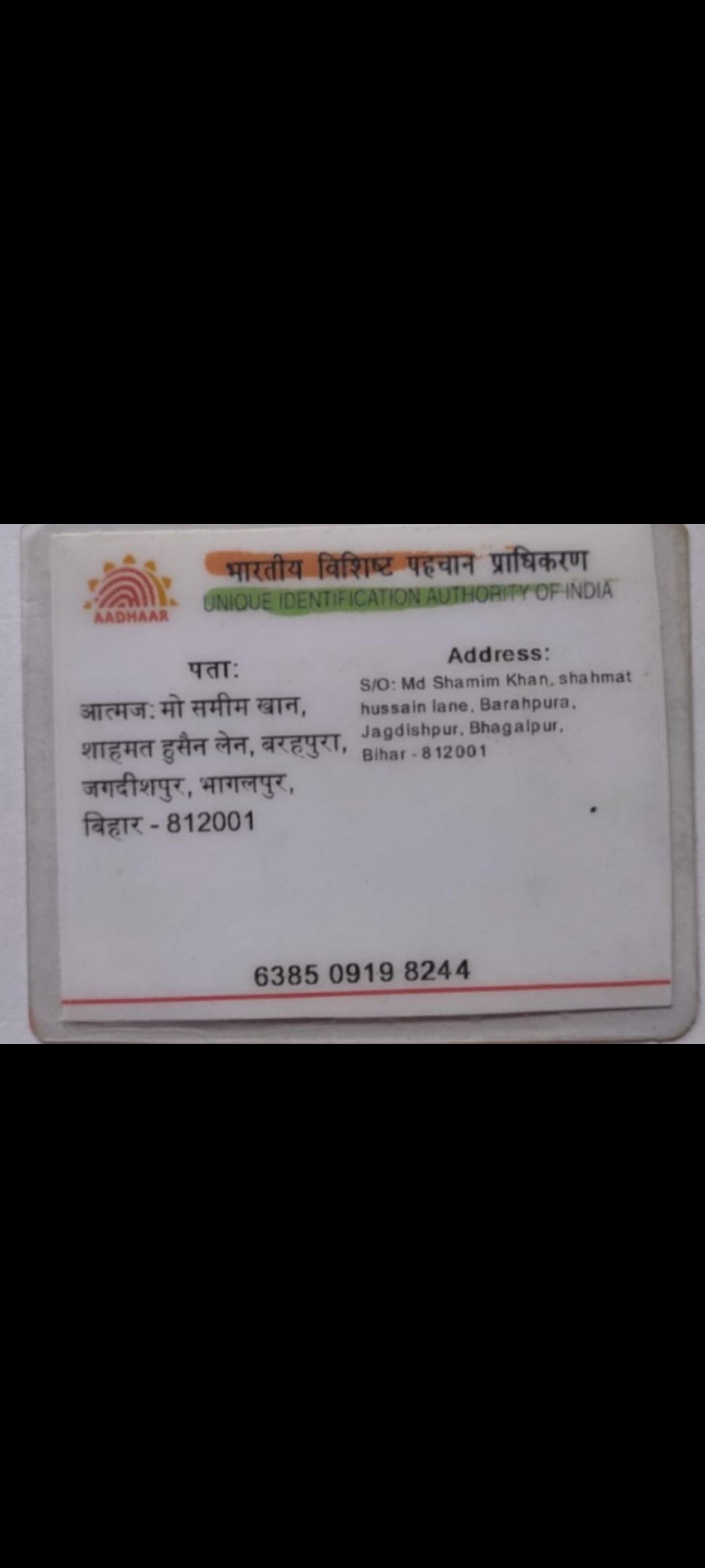 Complete Address (As per Aadhar)SHAHMAT HUSSAIN LANE, BARAHPURA JAGDISHPUR BHAGALPUR
