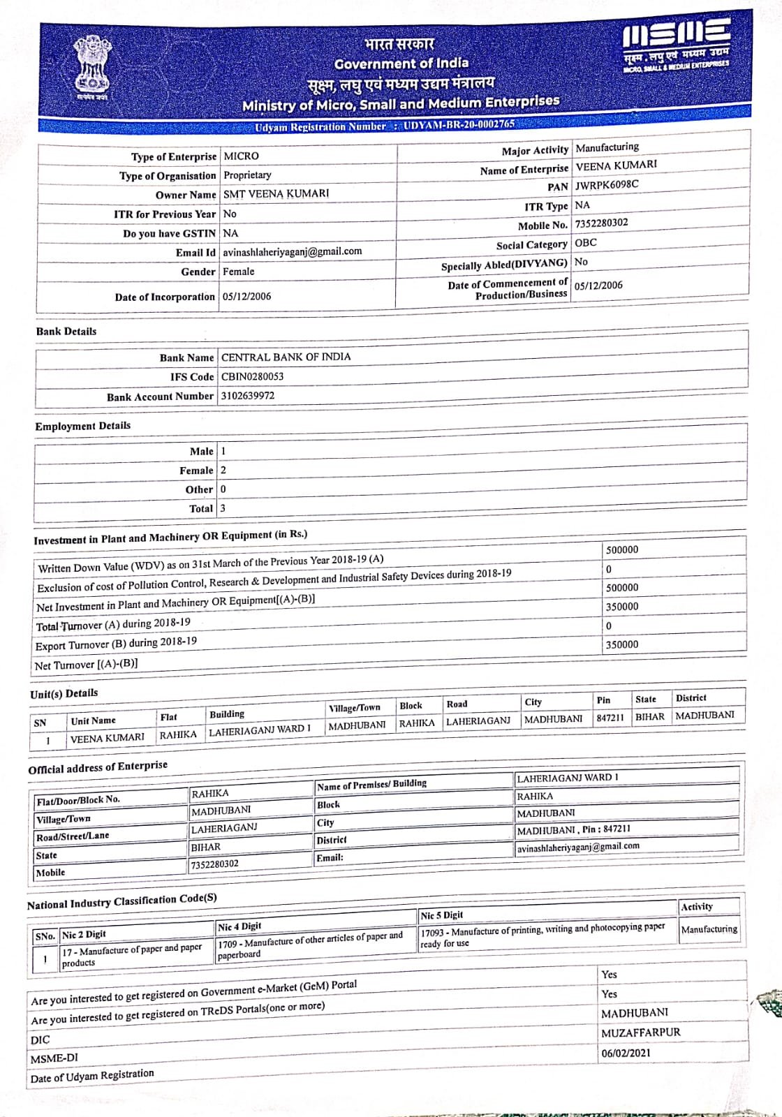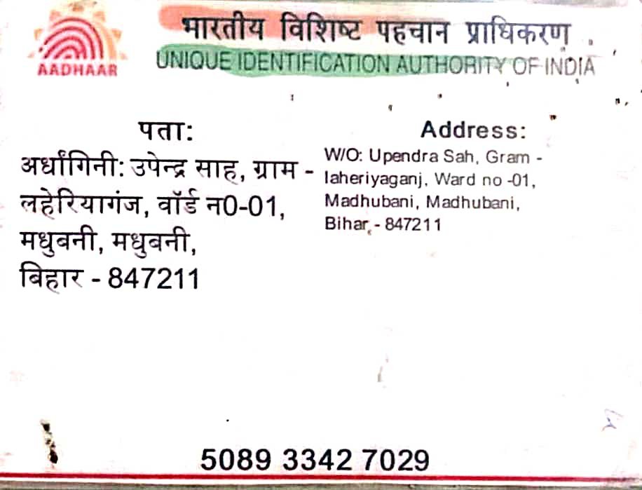 Complete Address (As per Aadhar)laheriyaganj ,Ward no - 1, Madhubani