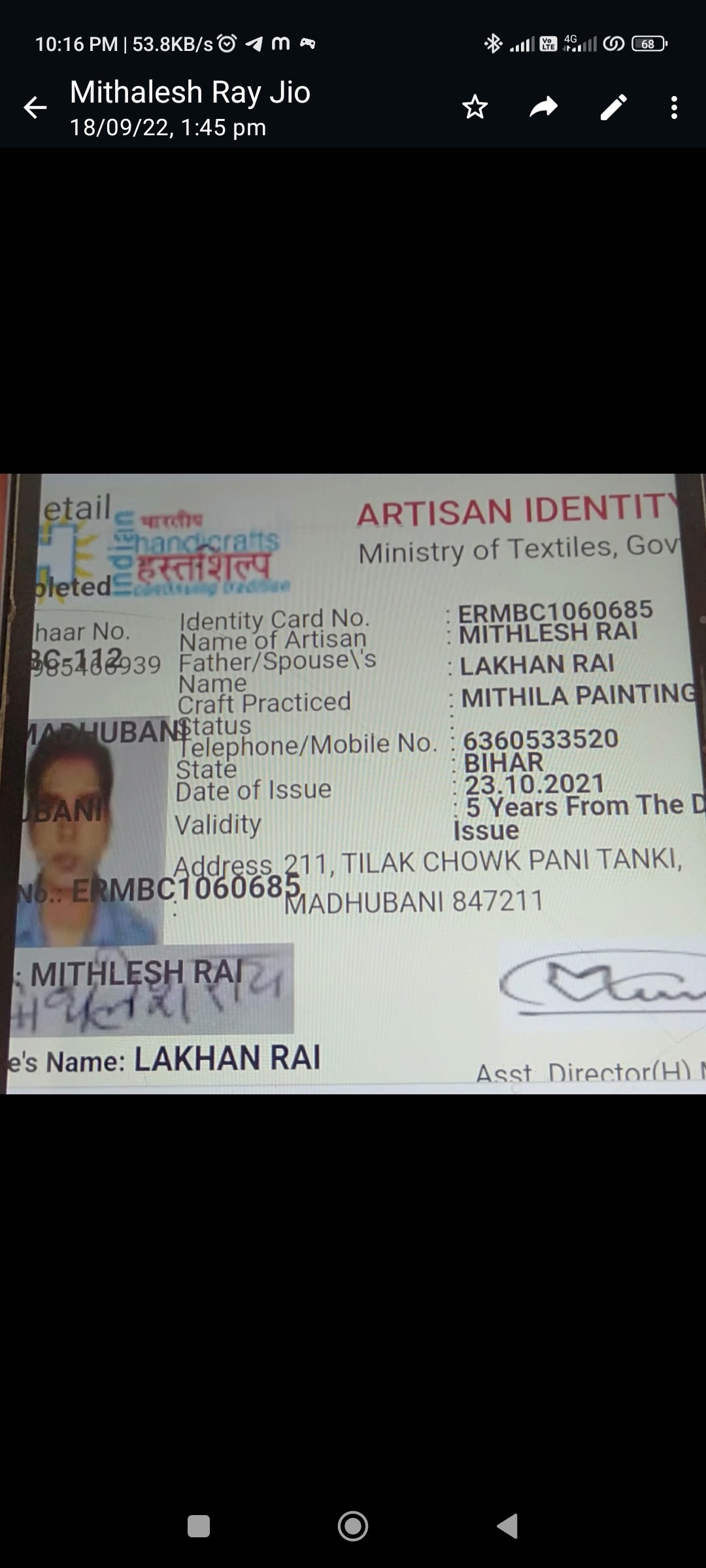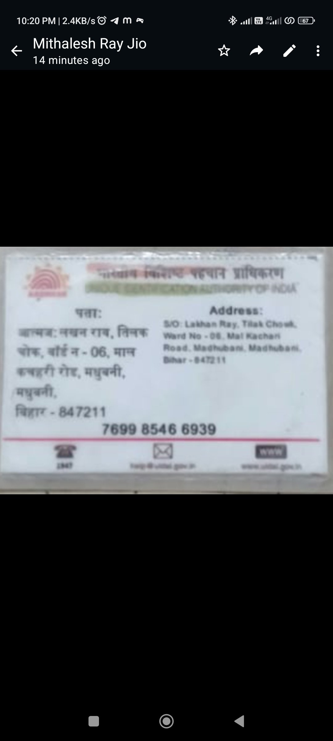 Complete Address (As per Aadhar)Gram tilak Chok mal kachahari ward no6 madhubani