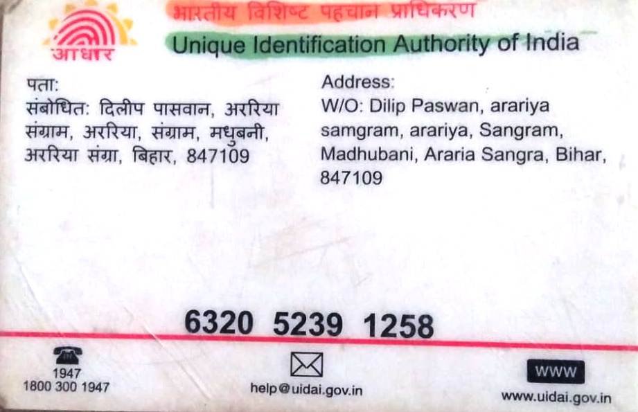 Complete Address (As per Aadhar)W/O-DILIP PASWAN, ARARIYA SAMGRAM, ARARIYA, SANGRAM, MADHUBANI SANGRAM, BIHAR