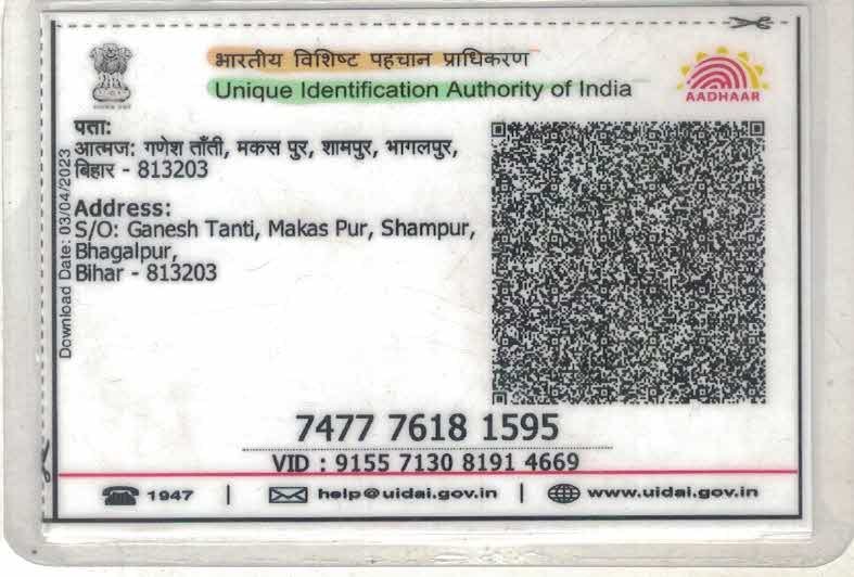 Aadhar No.7477-7618-1595