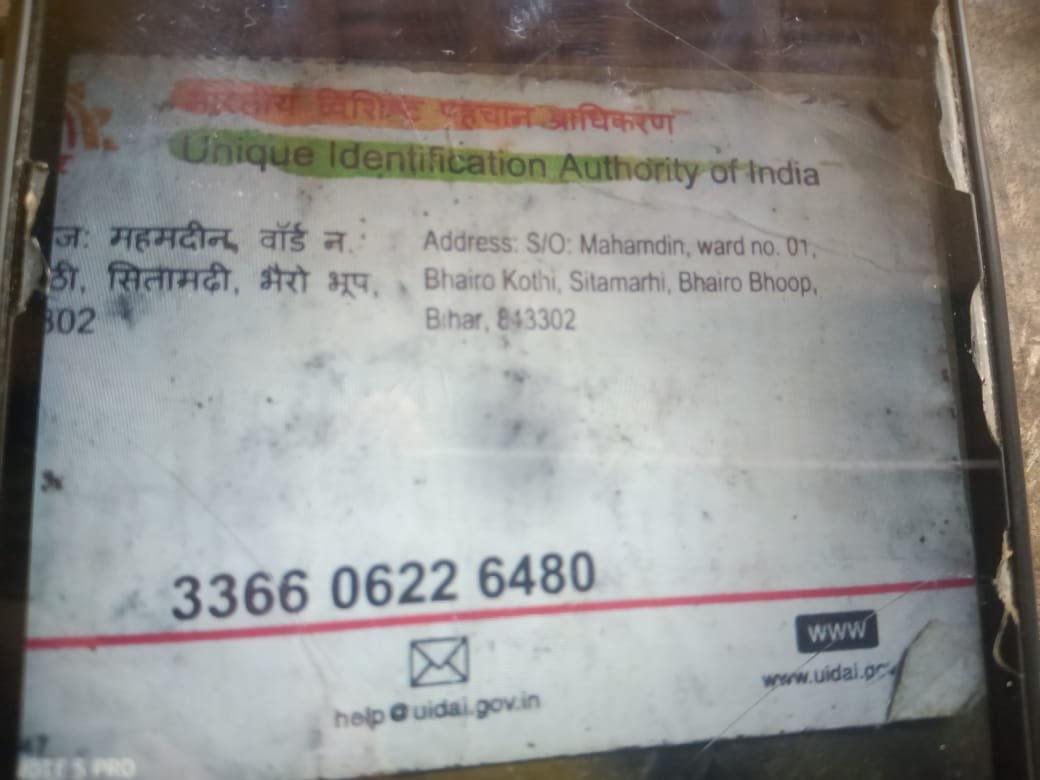 Complete Address (As per Aadhar)S/O-MAHAMDIN, WARD NO-01, BHAIRO KOTHI, SITAMARHI BIHAR 843302