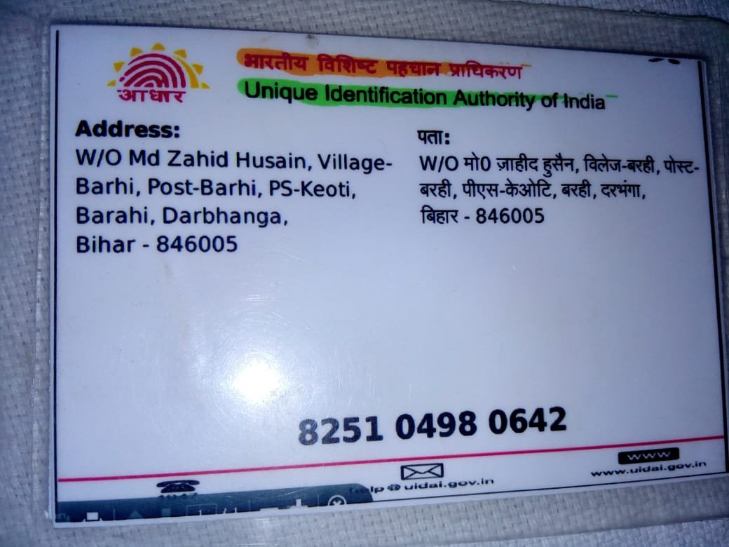 Complete Address (As per Aadhar)W/O-MD ZAHID HUSAIN, VILL-BARHI,PO-BARHI,PS-KEOTI,BARHI,DARBHANGA,BIHAR,846005