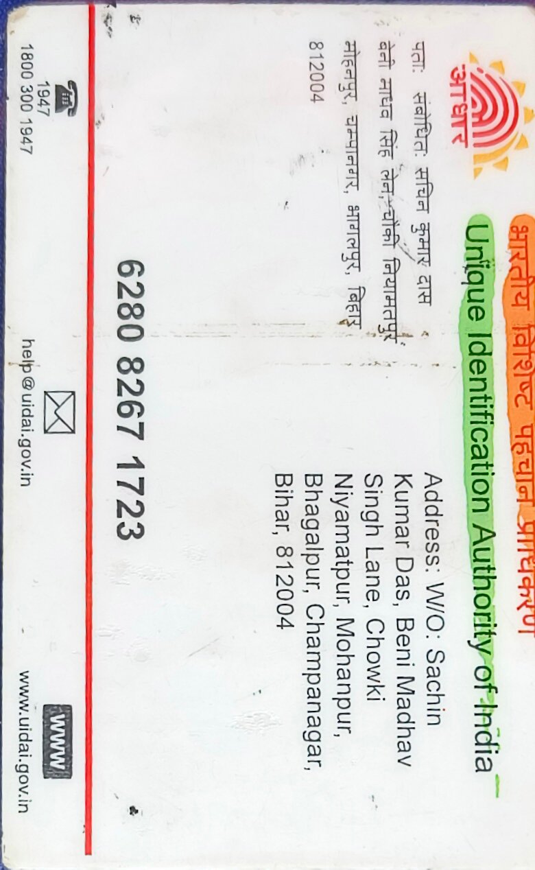 Complete Address (As per Aadhar)BM Singh lane.Champanagar.Nathnagar.Bhagalpur